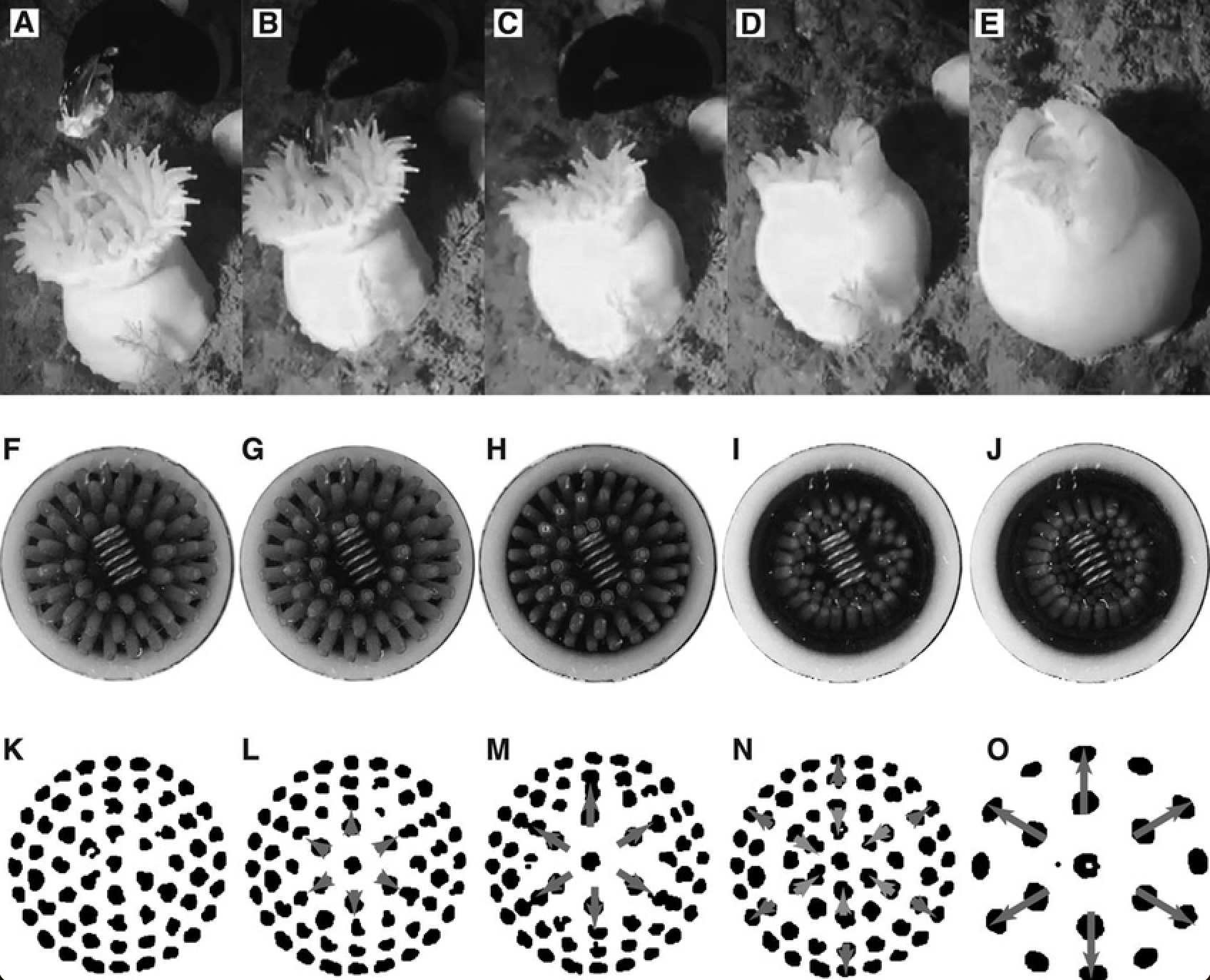 Jellyfish are the ones usually extensively referenced in soft robotics research, but I got mesmerized by another creature. Sea anemones seem to have just that type of contract-and-expand form I'm imagining. They change their shape between flowing open forms and compact spherical closed shapes when they detect touch or environmental changes. It has this soft geometric pattern that moves back and forth between its shapes, it breathes, retreats, and envelopes, like a model of form-as-presence for my concept. Also it seems that the shape transitions are smooth, even gentle, and without any rigid frameworks, just responsive by nature.
