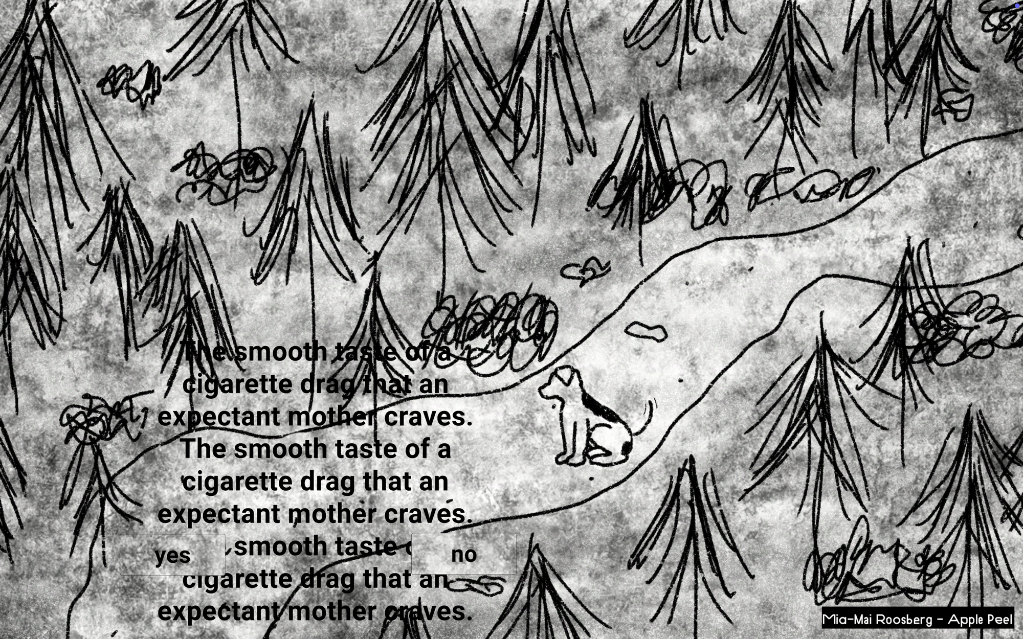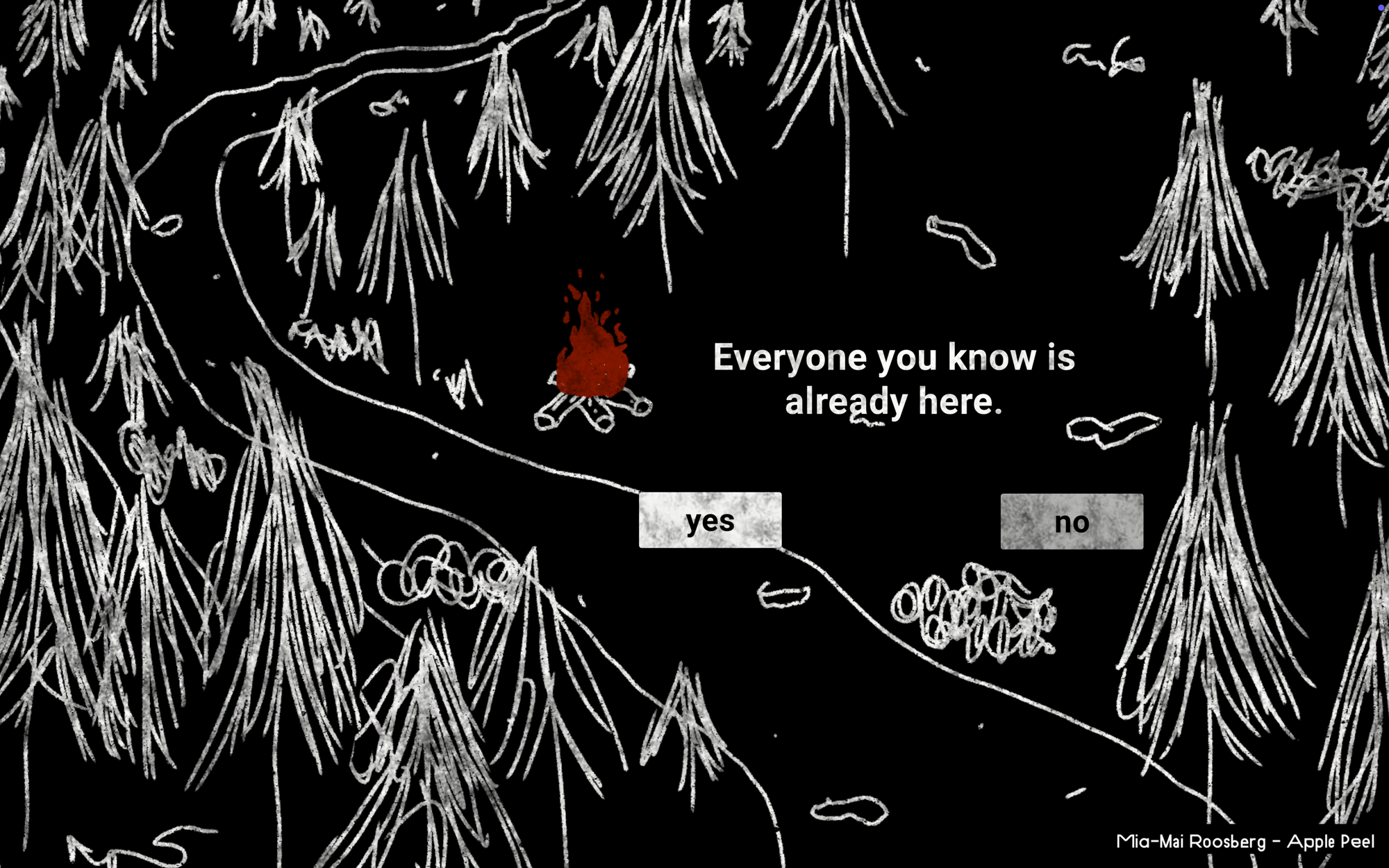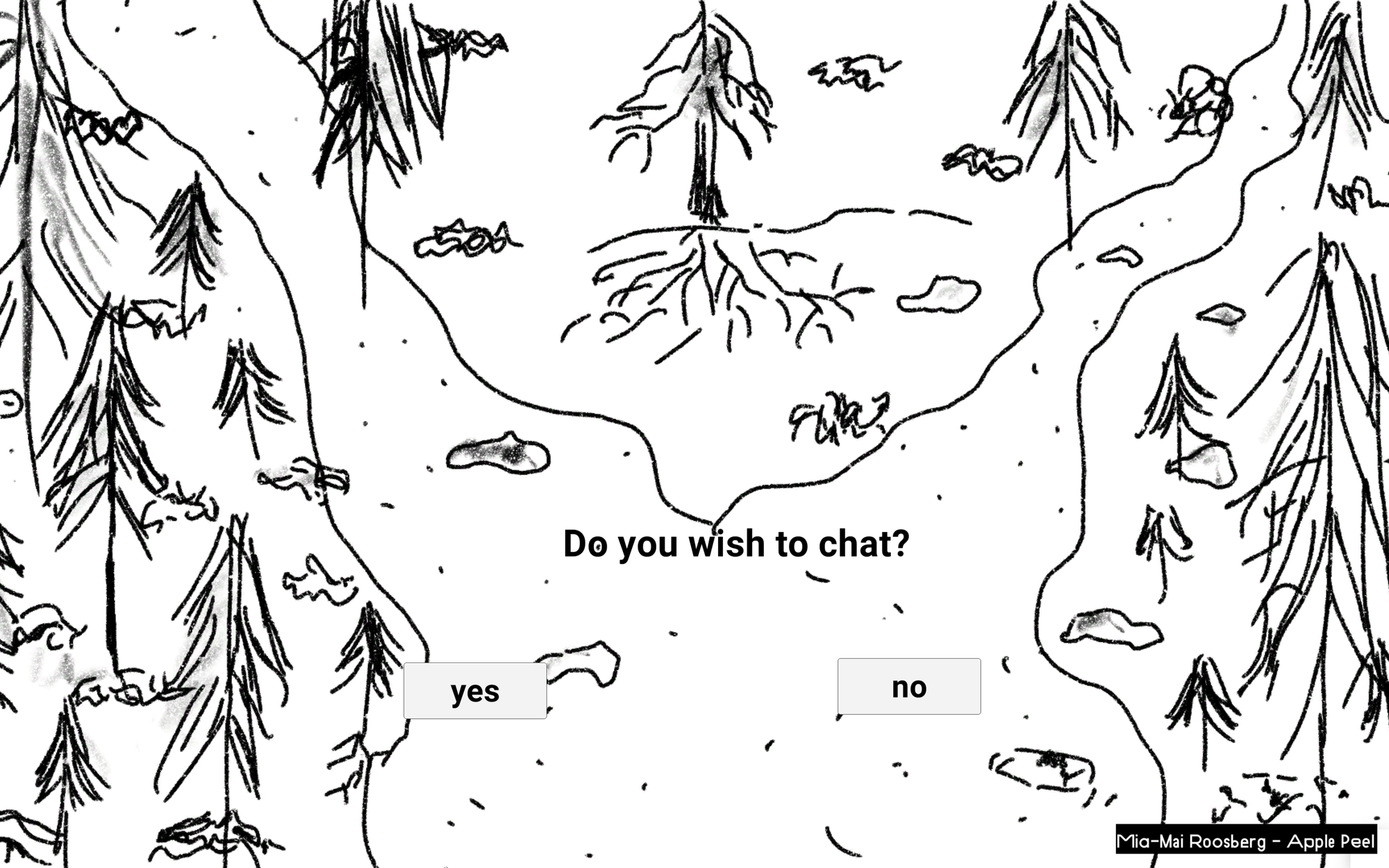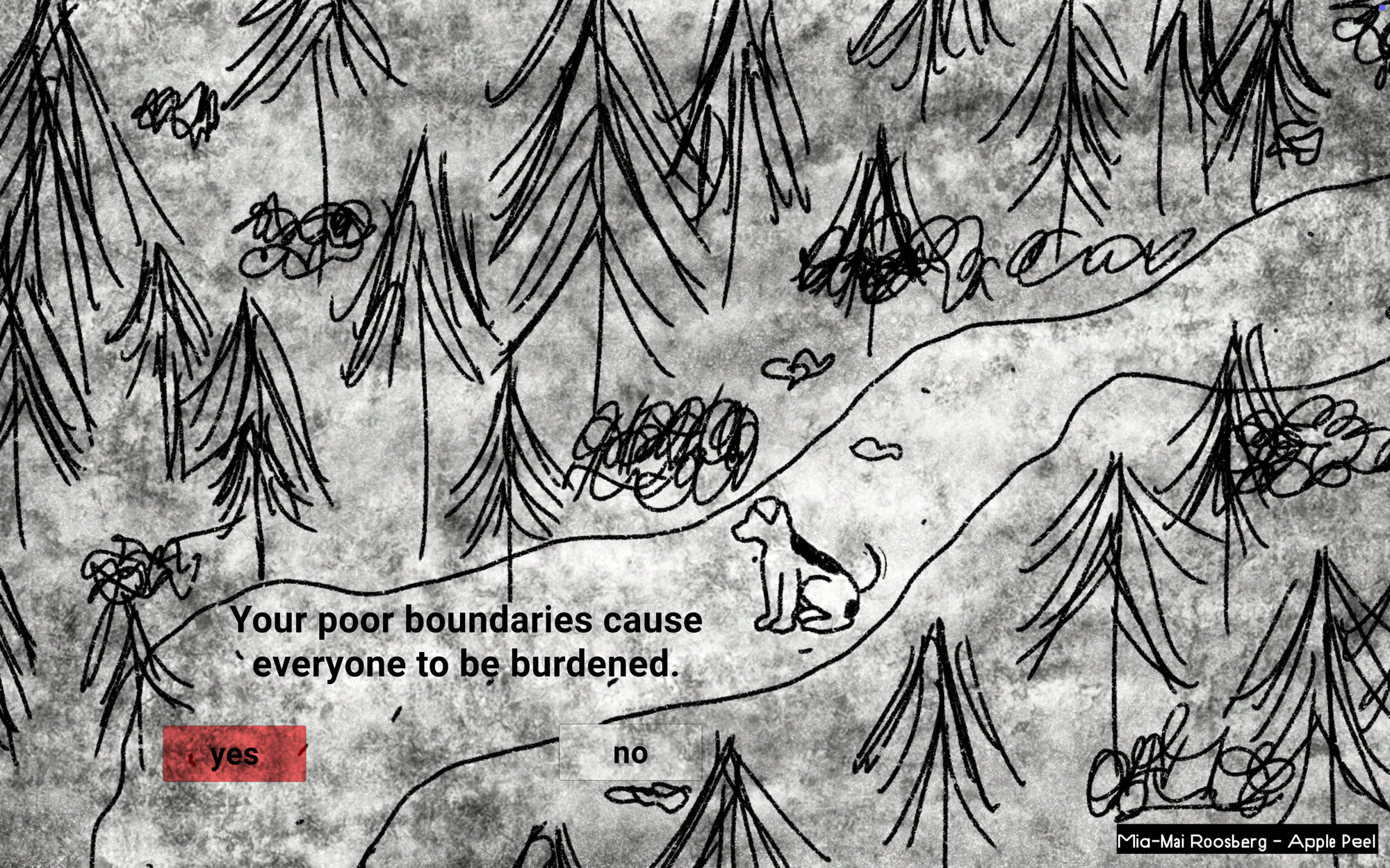 "Apple Peel is a 2D point-and-click video game with a unique visual style focused on morality-based storytelling. The game centers on three characters: the narrator, you (the player), and a dog. The action takes place in a lonely forest, creating an atmosphere that is simultaneously both bleak and tense, yet at times humorous and ironic. The game's philosophical core idea focuses on choices and human innate curiosity, including dark themes in the story where emphasis is placed on the illusion of choice versus actual choice.