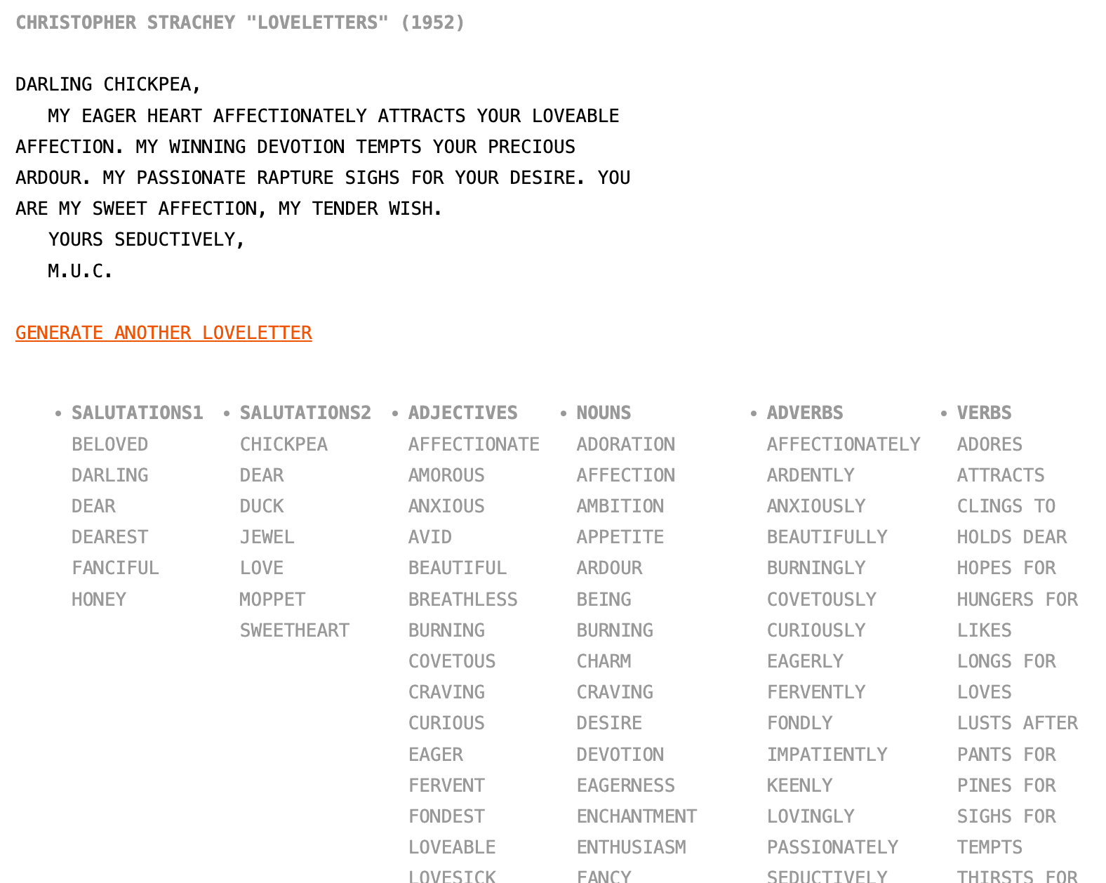 One of the first examples of electronic literature, Christopher Strachey created a program in the early 1950s that produced love letters using a combinatory algorithm. This work has been interpreted as a queer critique of heteronormative love expressions in digital art and literature, though that's a topic for another time!😄 Let's just see this as a playful perspective on algorithmic romance staking its first steps created by perhaps one of the first digital artists.